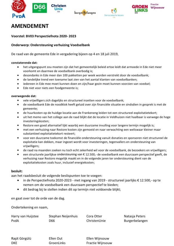 Helaas is dat concrete voorstel er nog steeds niet. Reden voor ons om een amendement mede in te dienen, waarin we vragen om structurele steun van de gemeente voor de voedselbank. De voedselbank is geen luxe, maar een - helaas - noodzakelijke basisvoorziening. Wat de ChristenUnie betreft neemt de gemeente daarin haar verantwoordelijkheid en draagt 12.500,- per jaar bij. Wij vinden dat een reëel bedrag.